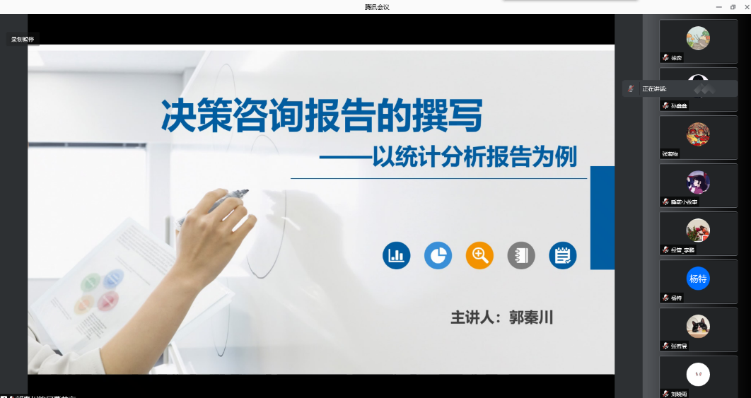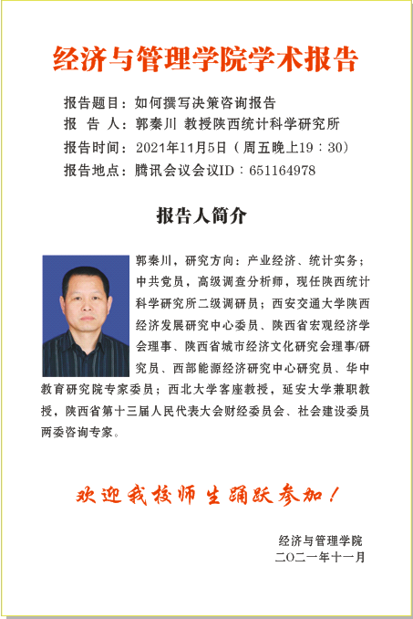 为进一步做好人文社科研究工作,提高教师将科研成果转化为政府咨询箴言报告的能力,11月5日,SUNBET申博邀请陕西统计科学研究所郭秦川研究员,为公司师生作了“如何撰写决策咨询报告”的线上讲座。