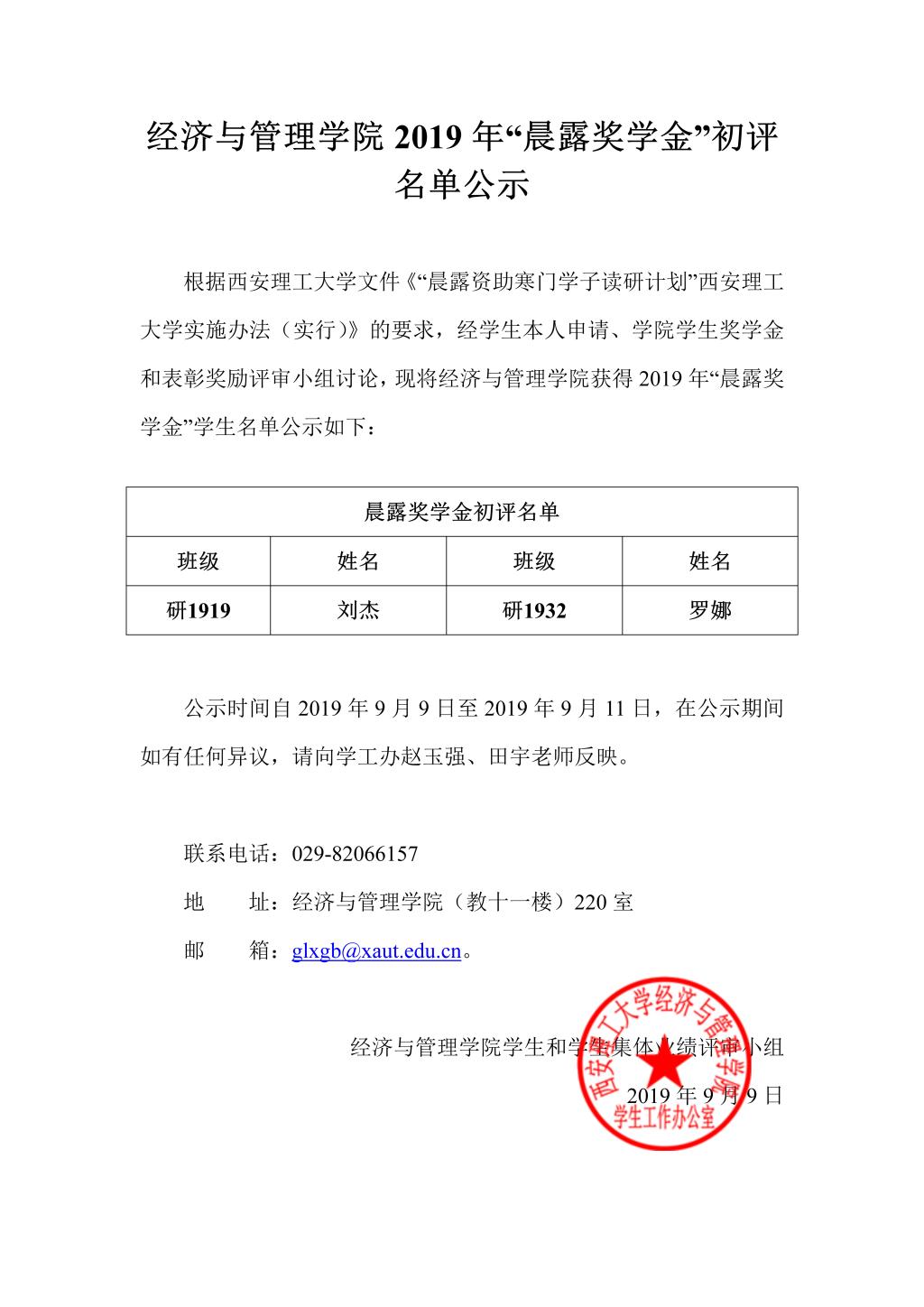 2019年晨露奖学金评审会劳务酬金发放公示单