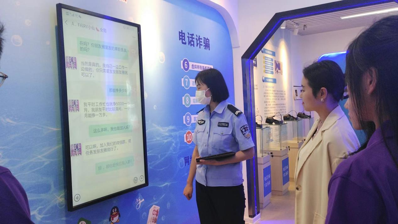 队员们深入体验馆中,馆内设置的触屏屏幕模拟行骗者利用微信、QQ、短信等网络平台诈骗的话术,还原了电信网络诈骗的全过程,队员们通过操控屏幕实现人机互动和“实践体验”,切身感受到了行骗者通过一步步设计让自己上当受骗的痛苦体验。