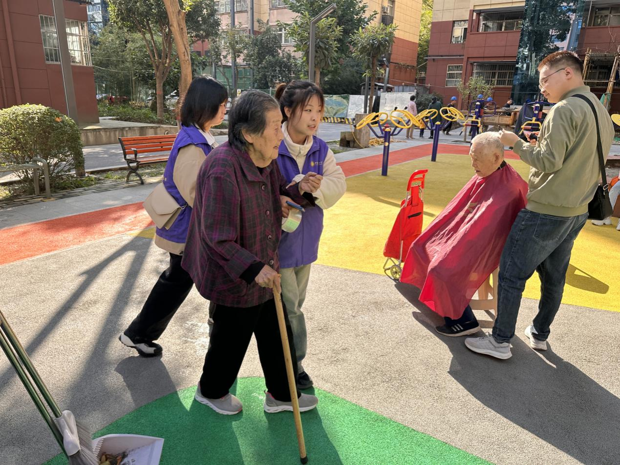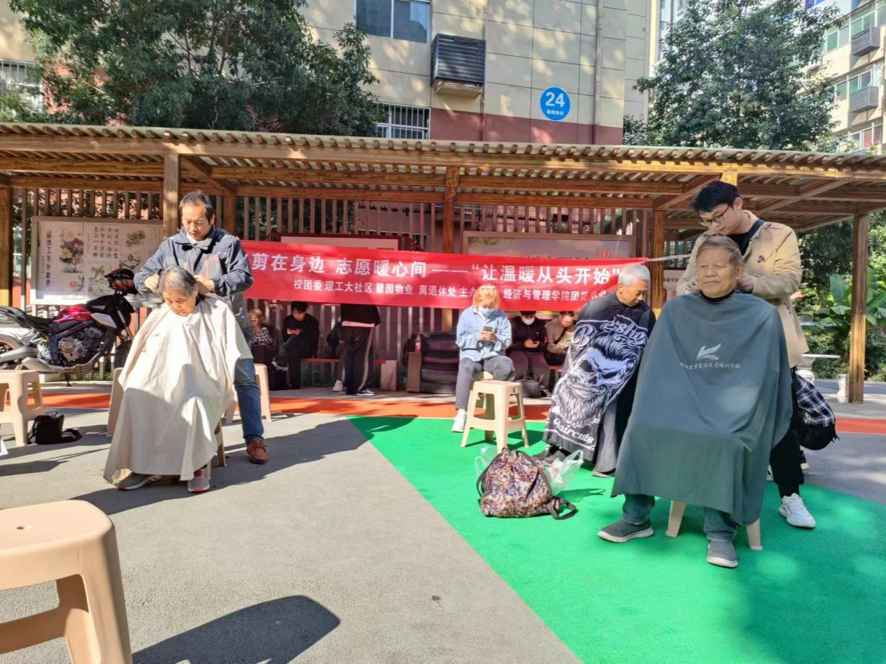 活动开始前与社区负责人协商,联系理发师,在到达社区与社区服务工作人员取得联系并做好各项准备工作后。活动在明媚的阳光下有序进行,理发师在开始理发前先询问老人的要求,一边精心地为老人修剪头发,一边亲切地和老人拉家常,时不时问询老人的修改意见。在家长里短中听听老人的心声,让理发和等待过程变得不再枯燥乏味。老人们互相欣赏刚修剪好的发型,露出了满意的笑容。免费理发的志愿服务虽然看起来微不足道,却实实在在地打动了老人的心。爱系于发、情系于剪,此次活动更是弘扬了"奉献、友爱、互助、进步”的志愿服务精神,营造了爱老、尊老、助老的良好社会氛围。