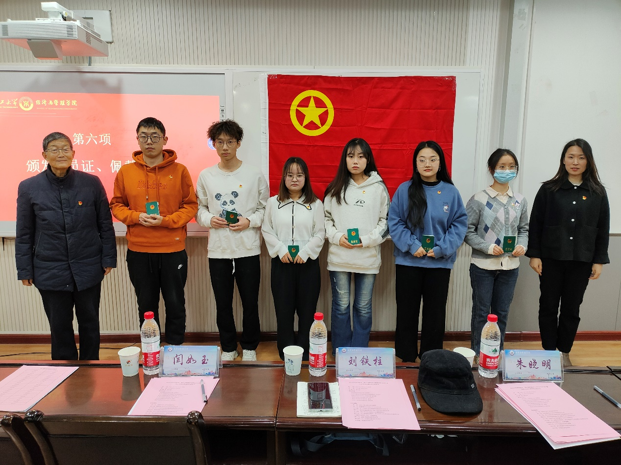 会议分为两个阶段。第一阶段,闫如玉宣读第二期入团积极分子提高班结业名单,余佩媛为学员颁发结业证书,并勉励同学们在新征程上做出新的贡献。第二阶段,杨沛锦宣读2023 年新发展团员名单,新发展团员代表胡雅雯发言,她倡导青年能够将自己的力量和热情投入到服务青年的事业中,为青年的成长和发展贡献自己的一份力量,同时也为社会主义建设贡献力量。刘铁柱、朱晓明为新发展团员颁发团员证、佩戴团徽,一面团旗就是一种信仰,一枚团徽就是一份力量,这个伟大的时代,属于有理想的每一个人。入团仪式在新发展团员的宣誓中落下帷幕。最后,刘铁柱作总结发言,他结合团员的权利和义务,结合一些先辈榜样,讲到“听党话,跟党走”是新时代共青团员应践行的铮铮誓言。他勉励青年团员们,把人生的方向立得更准,把奋斗的目标调得更高,把自身的形象立得更好。