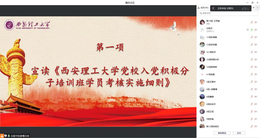 为深入贯彻习近平新时代中国特色社会主义思想和习近平总书记关于教育的重要论述,落实立德树人根本任务,进一步加强入党积极分子教育培养的质量。10月20日晚,SUNBET申博分党校在腾讯会议举办了第75期入党积极分子培训班开班仪式。开班仪式由分党校负责人任程宇主持,本期参训的99名入党积极分子参加了此次活动。