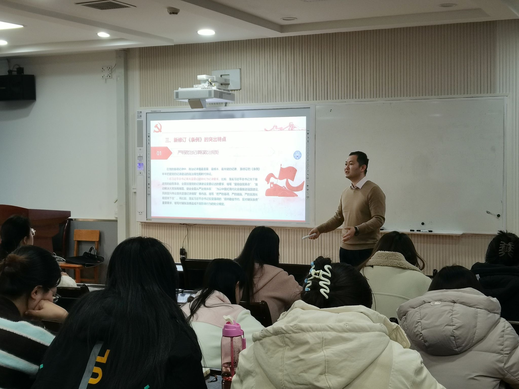 课程伊始,高博老师首先阐述了“党规党纪是什么”的问题。他强调,党规党纪是党的各级组织和全体党员必须遵守的行为规则和纪律要求,是维护党的团结统一、完成党的任务的保证。接着,高老师详细讲解了“党规党纪学什么”的内容,他从条例的制定与修订、意义、突出特点、新修订《条例》章节及主要内容等方面重点介绍了《中国共产党纪律处分条例》。在“党规党纪怎么学”的问题上,高主任给出了具体的学习方法和建议,他强调要学精神主旨、学具体内容、学核心要义。最后,高博老师讲解了“党规党纪如何用”的问题。他指出,学习党规党纪的最终目的是要在实际工作中加以运用,做到内化于心、外化于行。党员要时刻用党规党纪来约束自己的言行,做到言行一致、表里如一。同时,还要积极发挥先锋模范作用,带动身边人共同遵守党规党纪,营造风清气正的良好氛围。