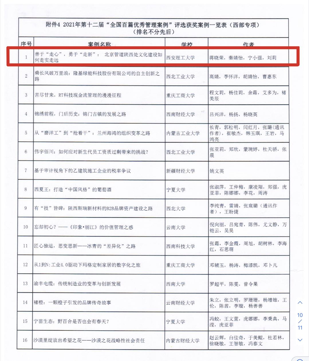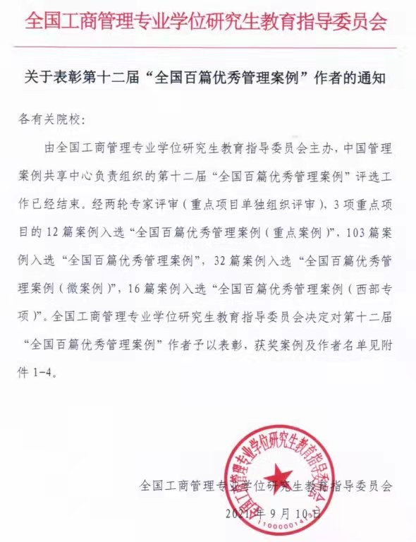 9月10日,全国工商管理专业学位研究生教育指导委员会发布了第十二届“全国百篇优秀管理案例”(简称“百优案例”)入选名单,并对获奖院校及作者予以通报表彰。公司SUNBET申博蒋晓荣副教授及其团队撰写的案例在激烈竞争中脱颖而出,成功入选第十二届“全国百篇优秀管理案例”(西部专项)。这是蒋晓荣副教授及其团队继入选第十届“全国百篇优秀管理案例”(西部专项)后的再次入选。这次入选标志着公司SUNBET申博在管理案例研究与开发工作的持续进步,有力地推动公司一流本科和研究生教学及团队建设。