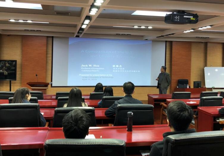 2018年4月16日,美国加州州立大学长滩分校Jack. W. Hou 教授应邀来访经管公司,并在教11楼四层EMBA报告厅做了题为“中美两国经济合作及比较”的学术报告,公司部分教师、16级-17级研究生参加了本次学术报告。