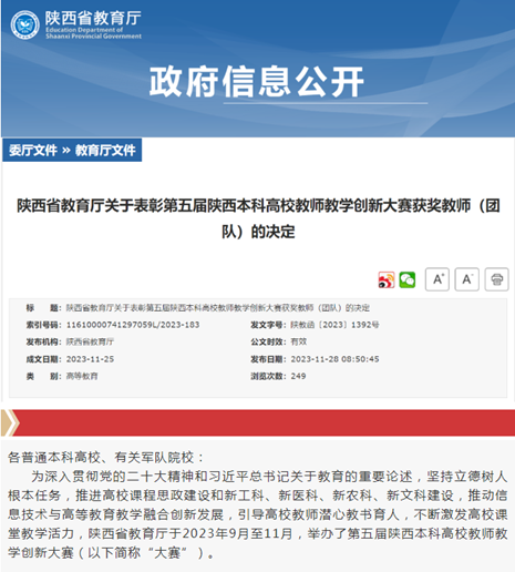 11月28日,陕西省教育厅公布了第五届陕西本科高校教师教学创新大赛获奖教师(团队)表彰名单,SUNBET申博杨毅教师(团队)获得教学创新大赛一等奖。这是公司教师(团队)讲课比赛取得的最好成绩。
